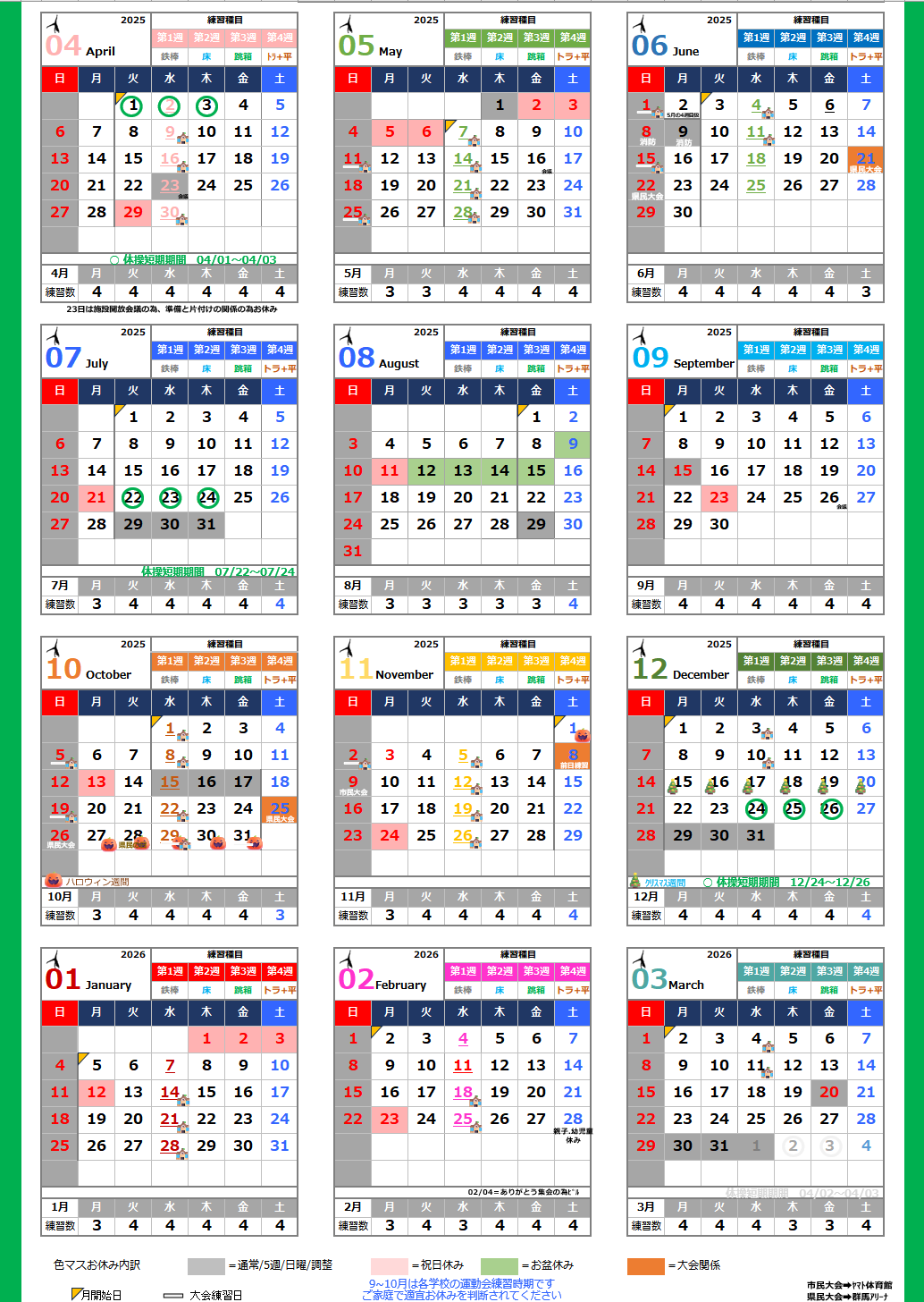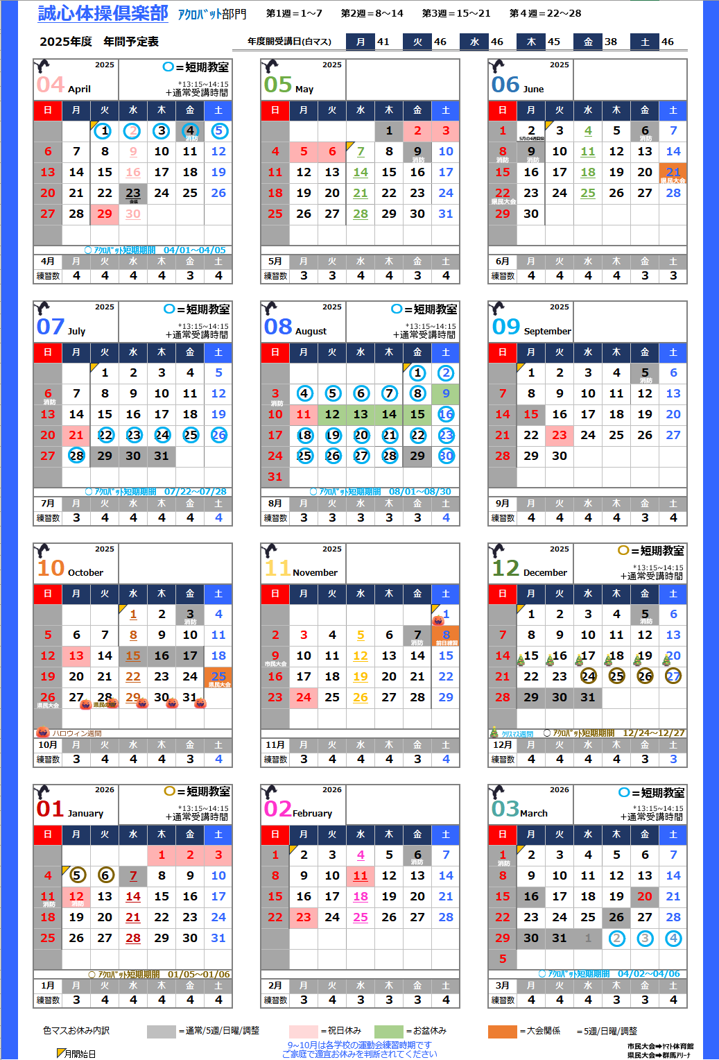・ハロウィン期間とクリスマス期間の体操クラス振替は、2025年度で停止いたします。