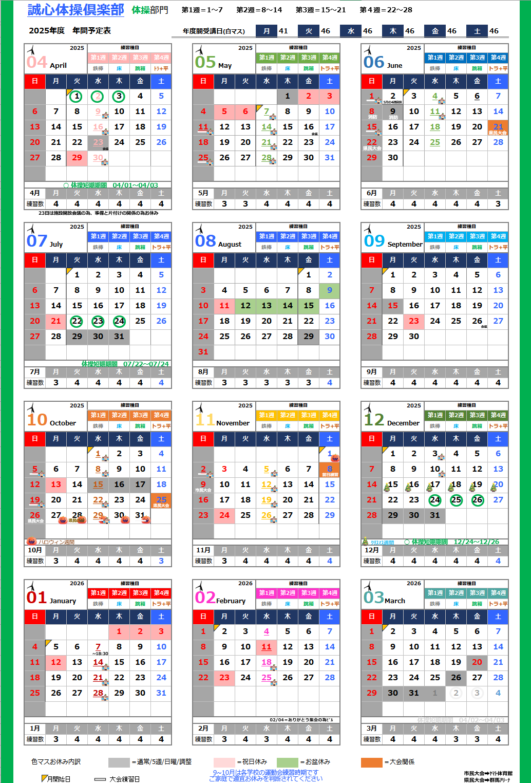 ・ハロウィン期間とクリスマス期間の体操クラス振替は、2025年度で停止いたします。